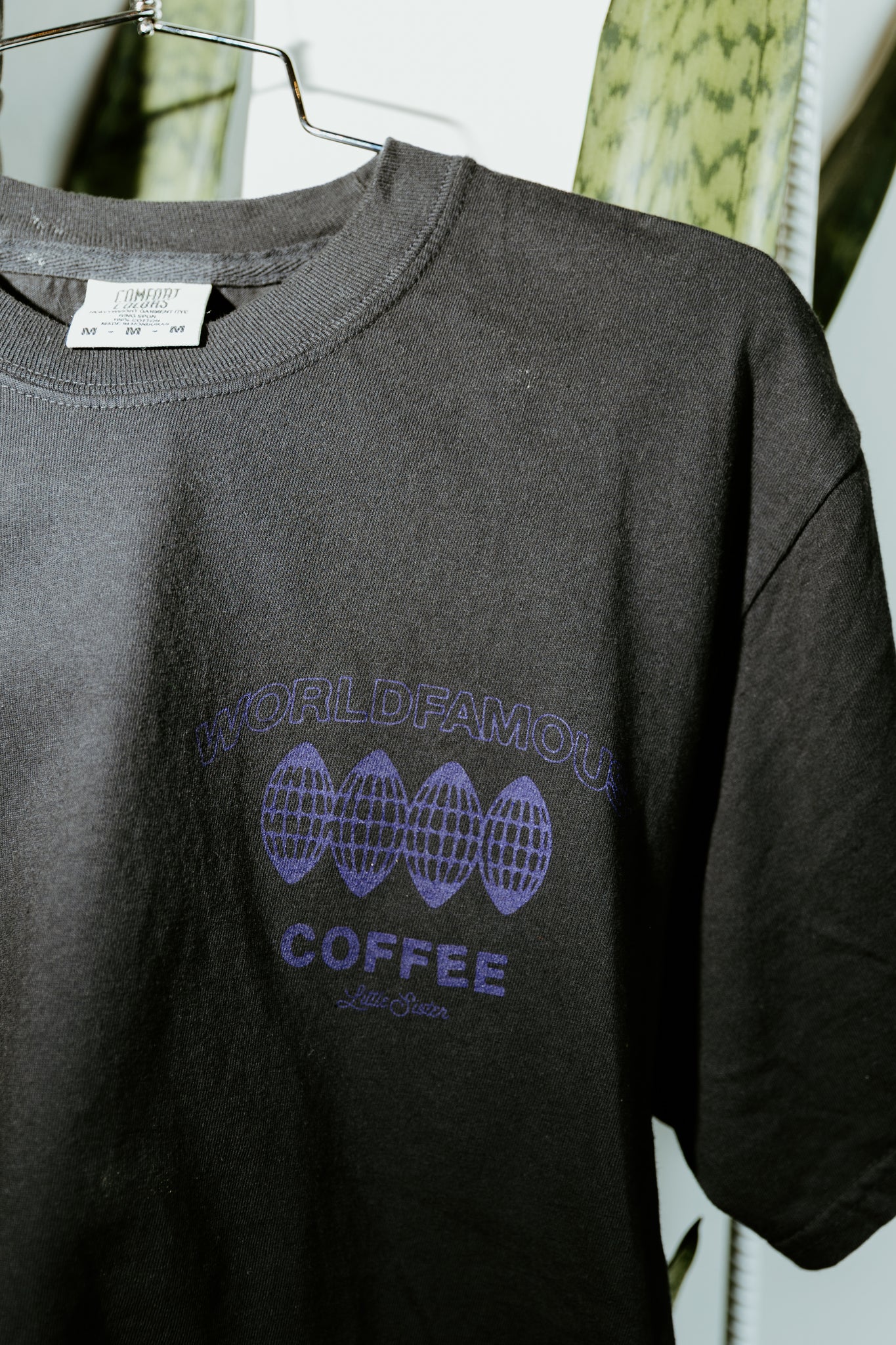 A cute and comfy tshirt! Purple World Famous Coffee on front left breast, and Froggy clip art design in purple and orange on the back. Black Comfort Colors tshirt. Designed by our friend Kyle at Deskwork Studio.